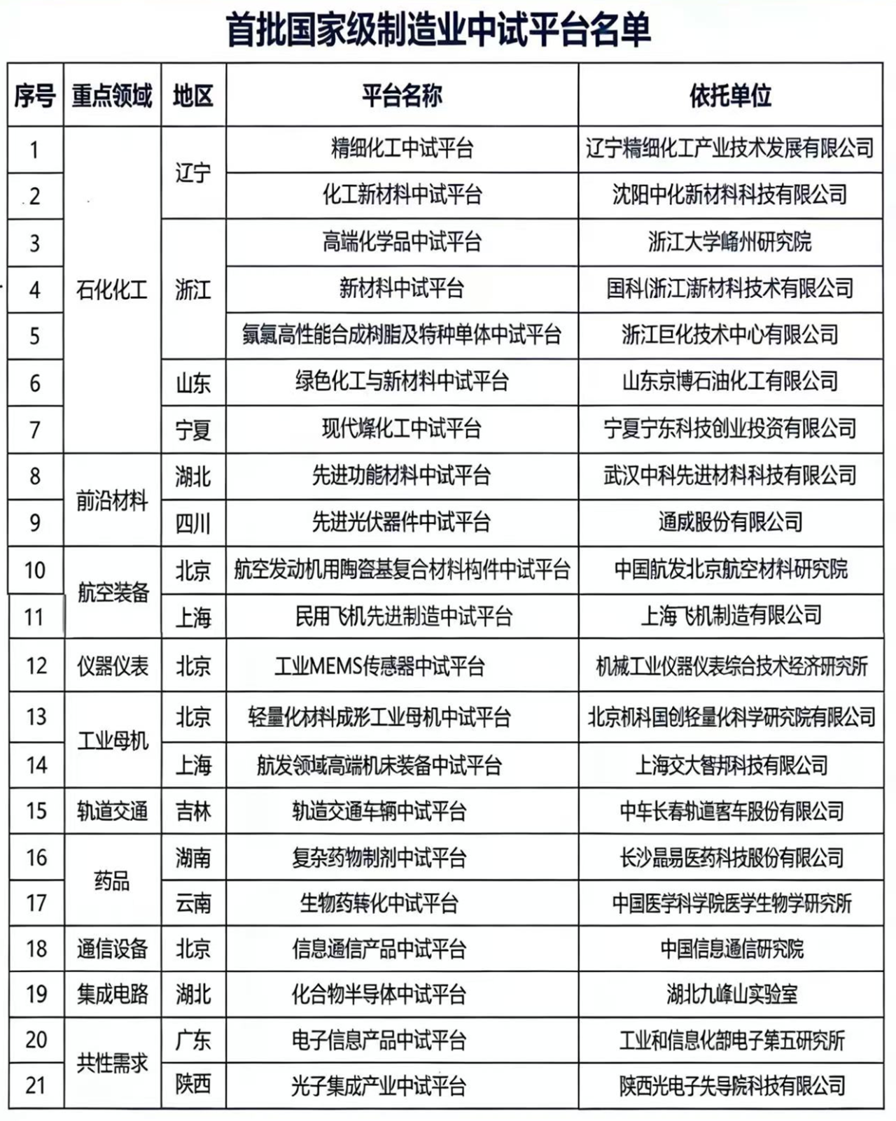 近日,工業和信息化部在遼寧省盤錦市召開制造業中試創新發展座談會。會上發布了首批國家級制造業中試平臺名單,全國共有21家平臺入選,分布在石化化工、集成電路、前沿材料、儀器儀表、工業母機等多個領域。