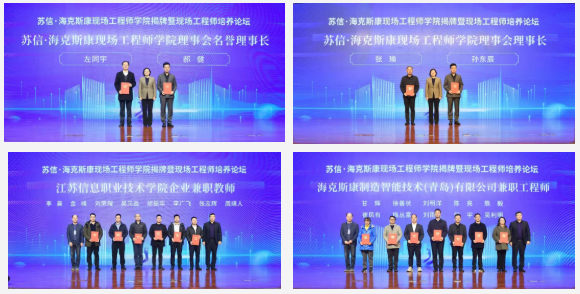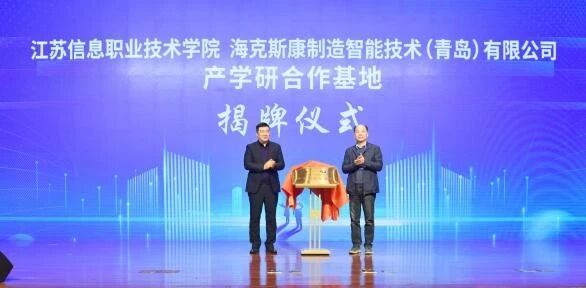 在與會嘉賓的共同見證下,“蘇信·??怂箍惮F場工程師學院”正式揭牌成立。同期,“江蘇信息職業技術學院·??怂箍抵圃熘悄芗夹g(青島)有限公司產學研合作基地”也完成揭牌。