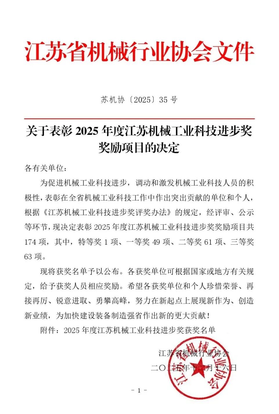 蘇試試驗榮獲2025 年度江蘇機械工業科技進步獎一