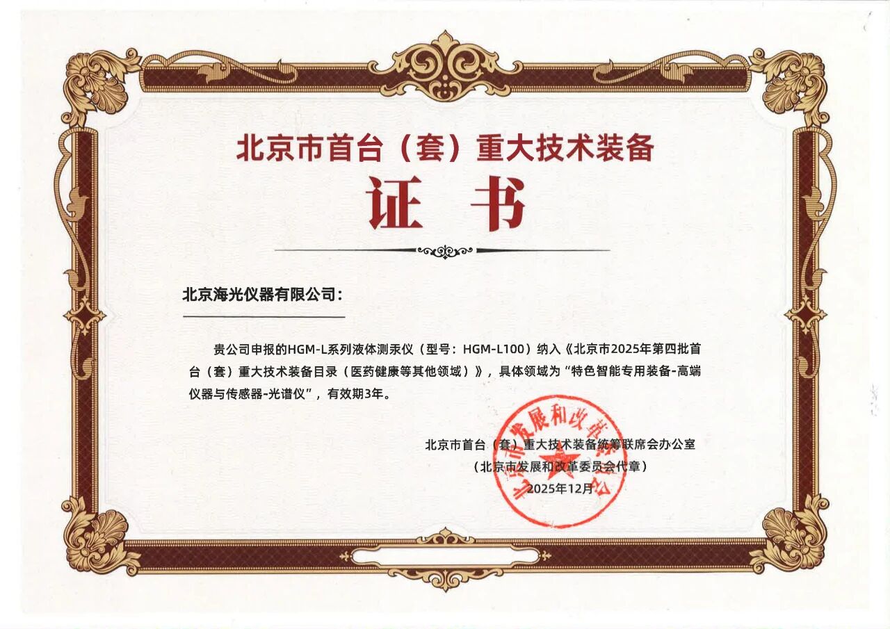 近日,北京市發展和改革委員會正式發布2025年北京市第四批首臺(套)重大技術裝備目錄,海光公司自主研發的“HGM-L液體測汞儀”成功入選。這標志著該設備在技術創新、性能指標及市場應用前景方面獲得了官方權威認可。