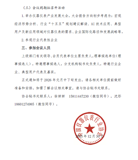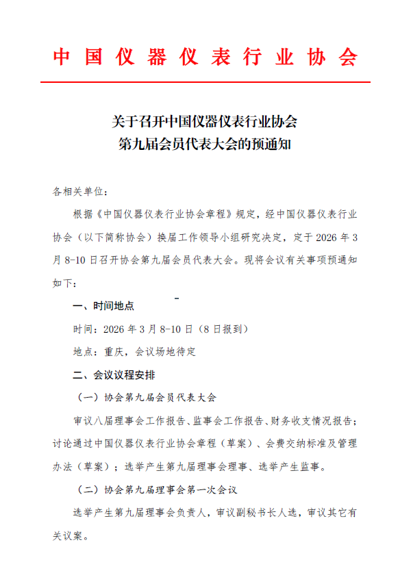 根據《中國儀器儀表行業協會章程》規定,經中國儀器儀表行業協會(以下簡稱協會)換屆工作領導小組研究決定,定于2026 年3月8-10 日召開協會第九屆會員代表大會。現將會議有關事項預通知如下: