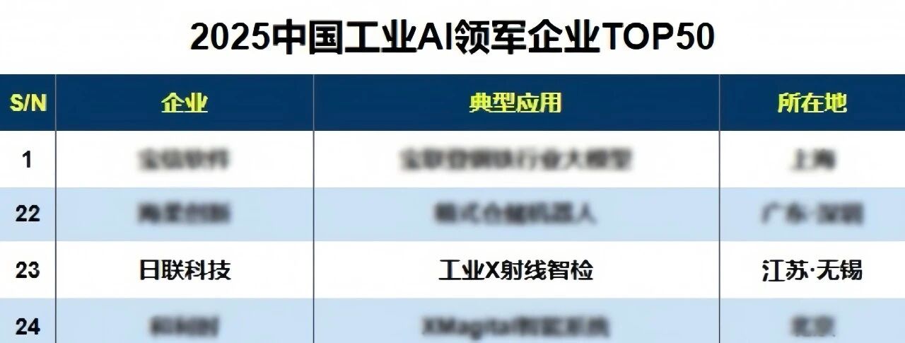 *2025中國工業AI領軍企業TOP50》榜單覆蓋工業機器人、智能質檢、工業大模型等核心賽道,反映了中國工業AI技術從單點應用向全流程滲透的趨勢。