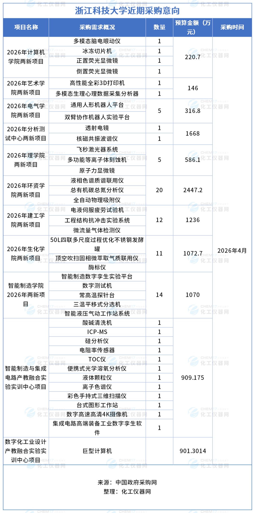 近期,浙江科技大學(xué)發(fā)布多項(xiàng)儀器采購(gòu)意向,采購(gòu)預(yù)算金額10573.9764萬(wàn)元,涉及儀器設(shè)備包括透射電鏡、核磁共振波譜儀、飛秒激光器系統(tǒng)、多功能等離子體刻蝕機(jī)、原子力顯微鏡、液相色譜質(zhì)譜聯(lián)用儀、總有機(jī)碳總氮分析儀等。預(yù)計(jì)采購(gòu)時(shí)間2026年4月。