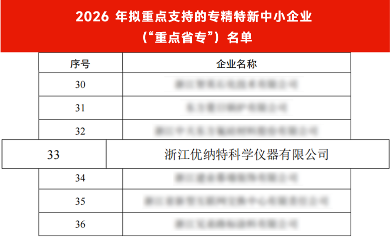近日,浙江省經濟和信息化廳公示了2026年擬重點支持的專精特新中小企業(“重點省專”)名單。400家企業實施融通入鏈“四提一強”推進計劃。浙江優納特科學儀器有限公司憑借雄厚的技術創新能力和市場影響力,成功入選。