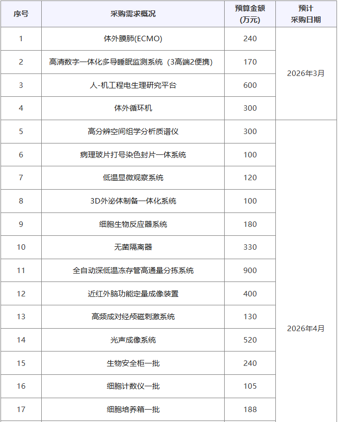 近期,上海臨床研究中心發布多項儀器采購意向,計劃采購高分辨空間組學分析質譜儀、低溫顯微觀察系統、細胞生物反應器系統、生物安全柜、細胞計數儀、二氧化碳細胞培養搖床、倒置熒光顯微鏡、超低溫冰箱等儀器設備,預算總金額15513.1萬元。預計采購時間2026年3月~5月。