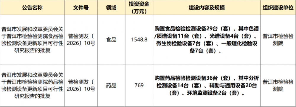 近日,普洱市發(fā)展和改革委員會正式批復(fù)普洱市檢驗檢測院食品、藥品兩大領(lǐng)域檢驗檢測設(shè)備更新項目可行性研究報告,兩個項目總投資達2317.8萬元,將通過超長期特別國債與單位自籌相結(jié)合的方式,全面提升區(qū)域食品藥品檢驗檢測技術(shù)水平,筑牢民生安全底線。