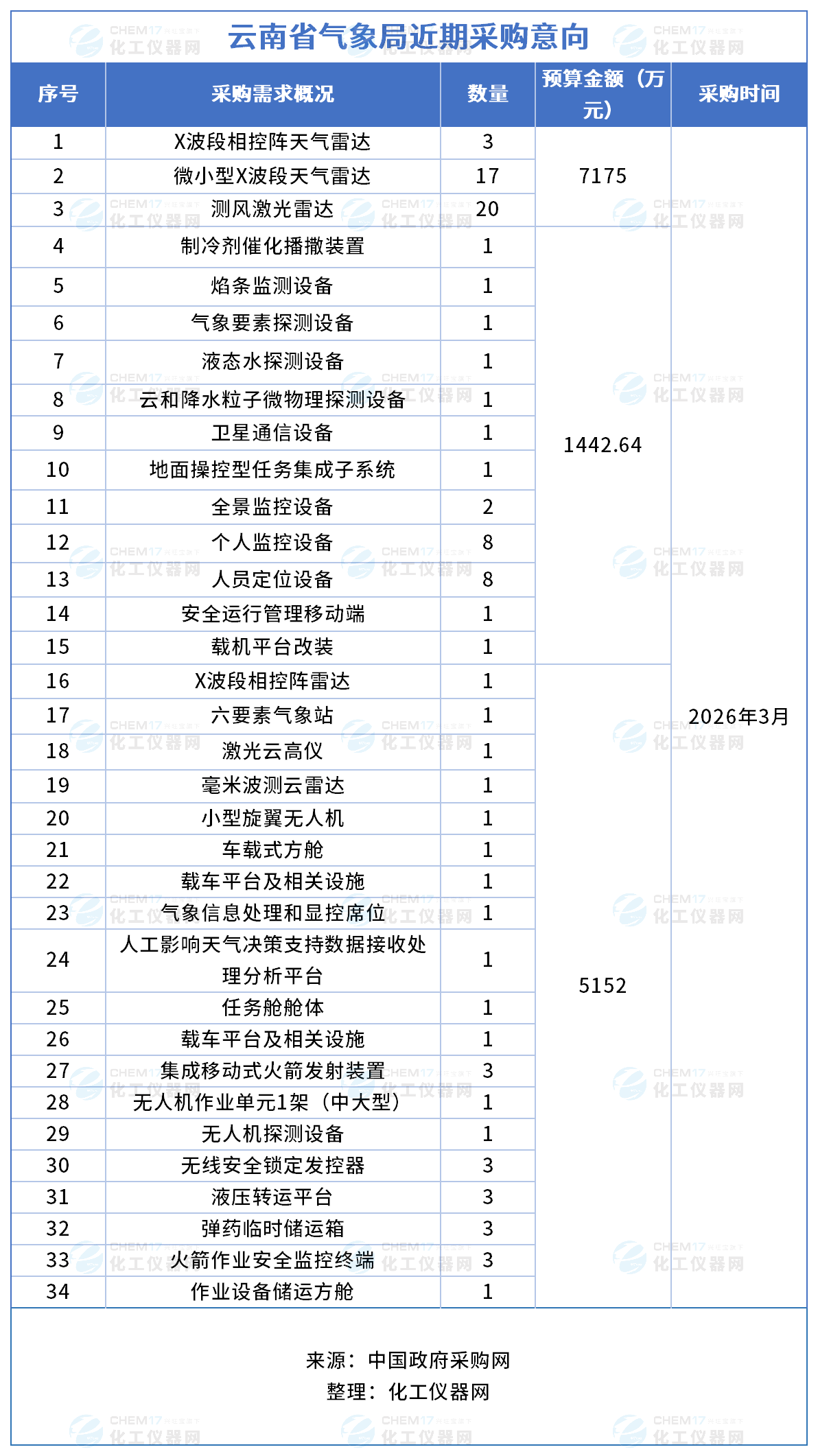 近期,云南省氣象局發布多項儀器采購意向,采購預算金額13769.64萬元,涉及儀器設備包括X波段相控陣天氣雷達、微小型X波段天氣雷達、測風激光雷達、制冷劑催化播撒裝置、焰條監測設備、氣象要素探測設備等。