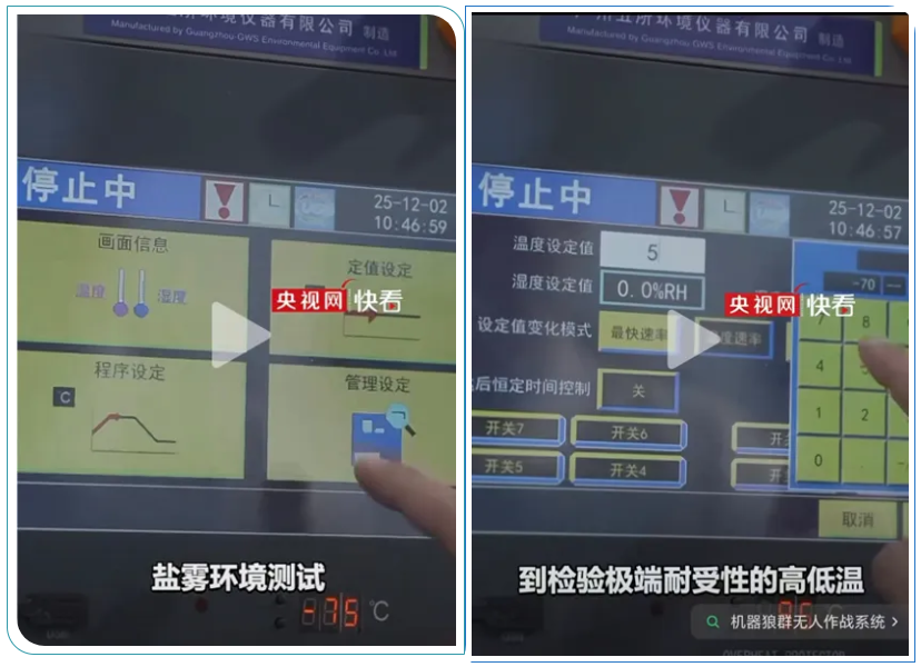 報道畫面中,廣五所公司多系列環(huán)境試驗設(shè)備協(xié)同發(fā)力:步入式試驗箱可對“機器狼”本體開展極端耐受性高低溫環(huán)境試驗,模擬極寒、高溫等復(fù)雜工況;快速溫度變化環(huán)境試驗箱則為關(guān)節(jié)電機等核心部件提供高強度的溫度沖擊驗證,精準考核部件在極端溫度交變下的性能穩(wěn)定性;同時,我司自主研發(fā)的設(shè)備控制器操作界面清晰呈現(xiàn),溫度、濕度、速率、恒定時間等關(guān)鍵環(huán)境參數(shù)實時可控,確保試驗過程精準可追溯。從核心部件的精細化測試到整機系統(tǒng)的極端環(huán)境驗證,廣五所公司設(shè)備全面助力“機器狼”完成了全鏈條可靠性考核,為打造更智能、更強健、更具實戰(zhàn)本領(lǐng)的機器狼批量化生產(chǎn)提供了關(guān)鍵數(shù)據(jù)支撐。