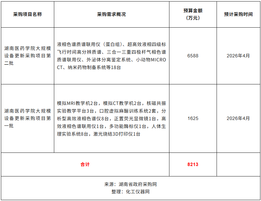 近日,湖南醫(yī)藥學(xué)院公布2026年2季度采購(gòu)意向,計(jì)劃采購(gòu)液相色譜質(zhì)譜聯(lián)用儀、外泌體分離鑒定系統(tǒng)、核磁共振實(shí)驗(yàn)教學(xué)平臺(tái)、分析型高效液相色譜儀、正置熒光顯微鏡、多功能酶標(biāo)儀等47臺(tái)儀器設(shè)備,預(yù)算總金額8213萬元。預(yù)計(jì)采購(gòu)時(shí)間2026年4月。