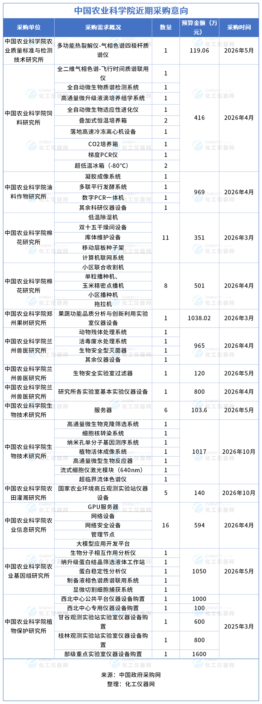 近期,中國農業(yè)科學院各院所發(fā)布多項儀器采購意向,采購預算金額12283.68萬元,涉及儀器設備包括多功能熱裂解儀-氣相色譜四極桿質譜儀、全二維氣相色譜-飛行時間質譜聯用儀、全自動微生物質譜檢測系統、高通量微升級液滴培養(yǎng)組學系統、全自動微生物適應性進化儀、疊加式恒溫培養(yǎng)箱、落地高速冷凍離心機設備等。預計采購時間2026年3月-10月。