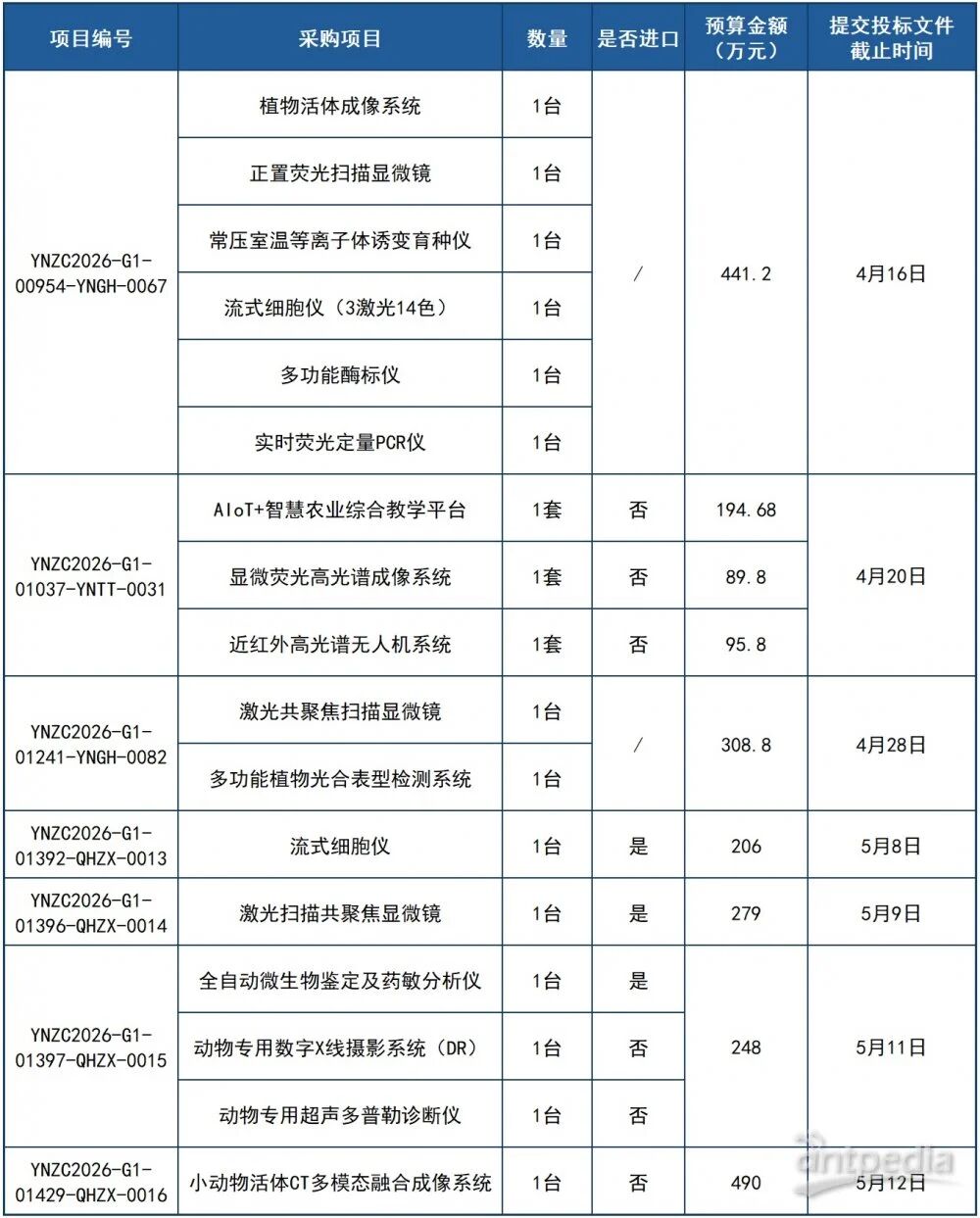 為全面提升教學科研水平,助力高水平農(nóng)業(yè)大學建設(shè),云南農(nóng)業(yè)大學近日正式公布重大教學科研儀器設(shè)備更新招標項目,涉及園林園藝學院、理學院及動物醫(yī)學院等多個學院。本次招標涵蓋植物活體成像系統(tǒng)、激光共聚焦掃描顯微鏡、小動物活體CT多模態(tài)融合成像系統(tǒng)、等一批尖端科研設(shè)備,總預(yù)算金額超2353萬元。