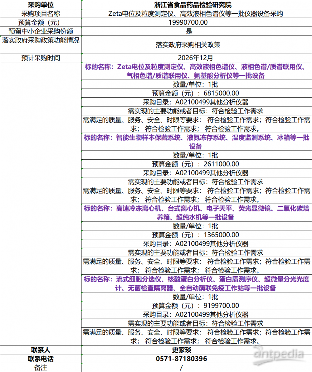 4月21日,浙江省食品藥品檢驗研究院發布 2026年8月-12月政府采購意向,預計12月份將采購包括 Zeta 電位及粒度測定儀、高效液相色譜儀、液相色譜 / 質譜聯用儀、氣相色譜 / 質譜聯用儀、氨基酸分析儀、高速冷凍離心機、臺式離心機、電子天平、熒光顯微鏡、二氧化碳培養箱、超純水機等共計 4 批儀器設備,采購預算總金額為 1999.07 萬元。詳情如下:為便于供應商及時了解政府采購信息,根據《財政部關于開展政府采購意向公開工作的通知》(財庫〔2020〕10 號)等有關規定,現將浙江省食品藥品檢驗研究院 2026年8月至12月采購意向公開如下: